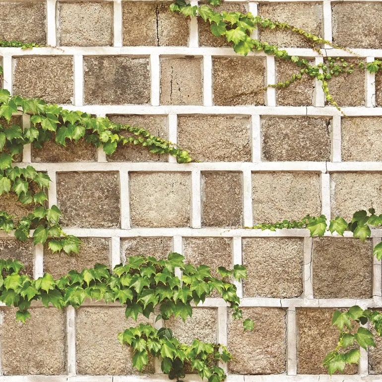 วอลเปเปอร์ห้องครัว ลายอิฐสีน้ำตาล มีใบไม้เลื้อยสีเขียว No.88428-1