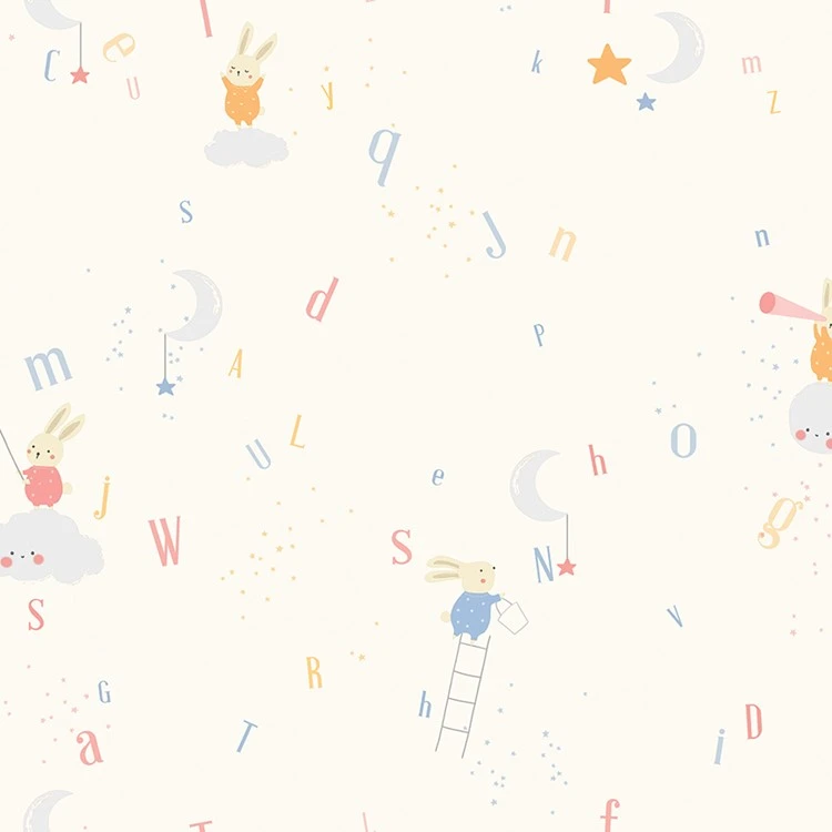 วอลเปเปอร์ห้องเด็กสีขาว ลายตัวหนังสือ กระต่าย เมฆ No.5155-1