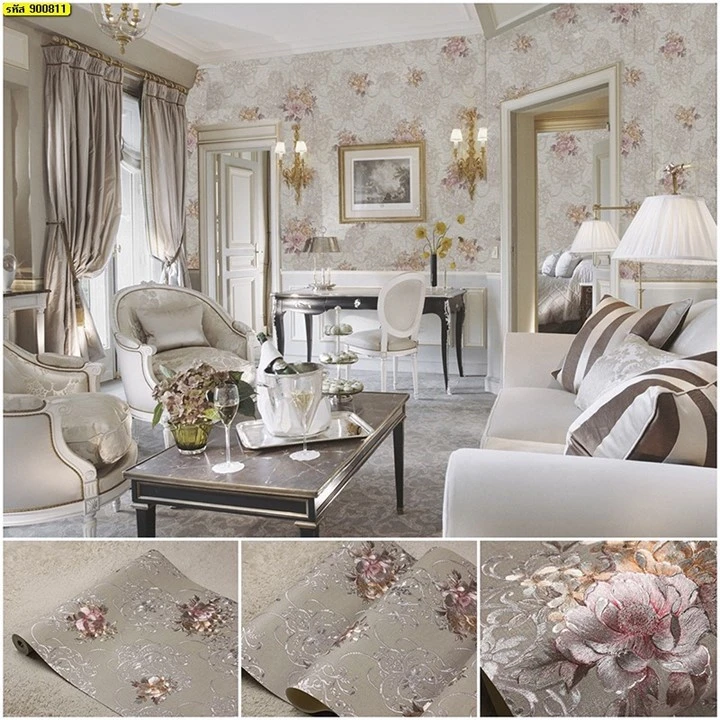 วอลเปเปอร์ลายหลุยส์ดอกไม้ สีชมพูพื้นเทาปนเงิน No.900811