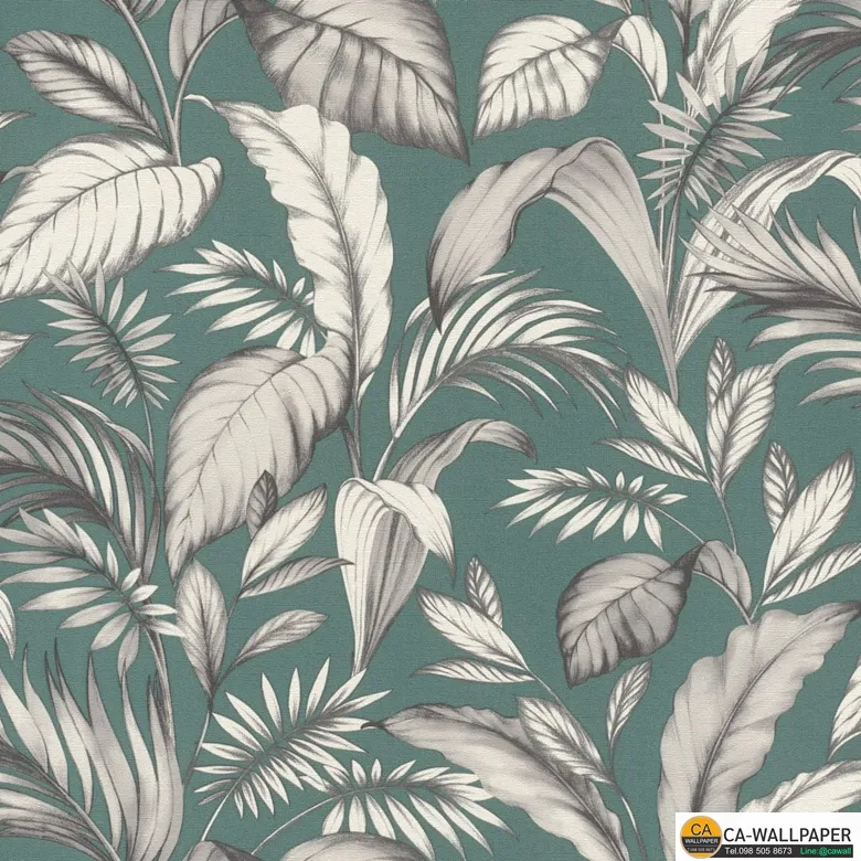 วอลเปเปอร์ลายใบไม้สไตล์ทรอปิคอล พื้นสีเขียวอมเทา No.464771